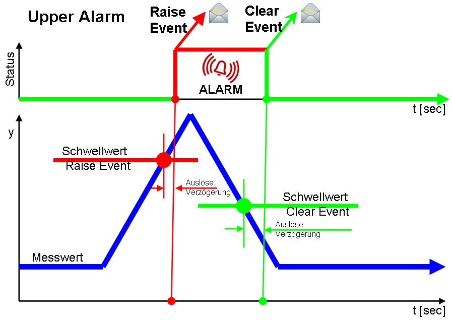 Mit dem optionalen Alarm-Managementsystem können alle von MiDASS erfassten Messwerte bei Grenzwertüberschreitungen alarmiert werden. Auch der Ausfall von angeschlossenen Geräten und Sensoren wird alarmiert. Die Emails eignen sich sowohl für Servicepersonal, können aber auch über eine XML- Schnittstelle, zur Anbindung an ISO 50001 Portale mit integriertem Alarmmanagement- System oder an externen handelsüblichen Trouble Ticket Systeme genutzt werden. Das Alarmsystem entspricht denen in der Industrie und dem Mobilfunk gebräuchlichen Richtlinien und –Normen, wie sie z.B. in der ETSI X733 definiert sind. Für jeden Messwert kann ein Upper und Lower Alarm definiert werden, die jeweils aus einem Alarm- Raise und einem Alarm- Clear Event bestehen. Um Fehlalarme zu vermeiden ist eine Hysterese und eine zeitliche Verzögerung definiert (siehe unten).
