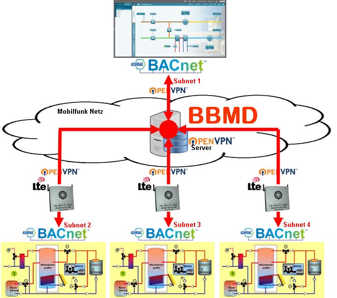 Beispiel: Einsatz von BBMD in einem via OpenVPN gesichertem IP- Netz, um dezentrale BACnet Anlagen über Mobilfunk an eine Leitstelle mit BACnet Schnittstelle anzubinden. Der OpenVPN Server wird hier auch als Router betrieben.
