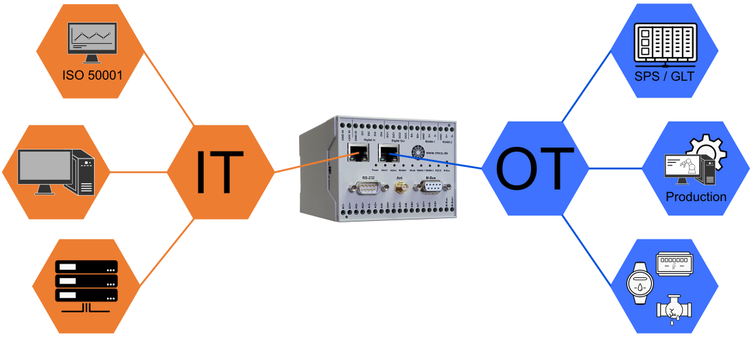 Die RmCU verfügt über die Möglichkeit, eine zweite Netzwerkschnittstelle per RJ45 zu nutzen und bietet damit optional zwei Ethernet-Anschlüsse anstelle des Mobilfunkmodems. Durch die integrierte Firewall können unsere Datenlogger und Multiprotokoll-Gateways sowohl im IT- als auch im OT-Umfeld eingesetzt werden. Dies ermöglicht eine physikalische Trennung zwischen dem Produktions- bzw. Zählernetzwerk und dem internen IT-Netz. Dank der klaren Trennung der beiden Netze durch die Firewall lassen sich erweiterte Netzwerkkonzepte realisieren, die sowohl Datensicherheit als auch Netzstabilität gewährleisten.
